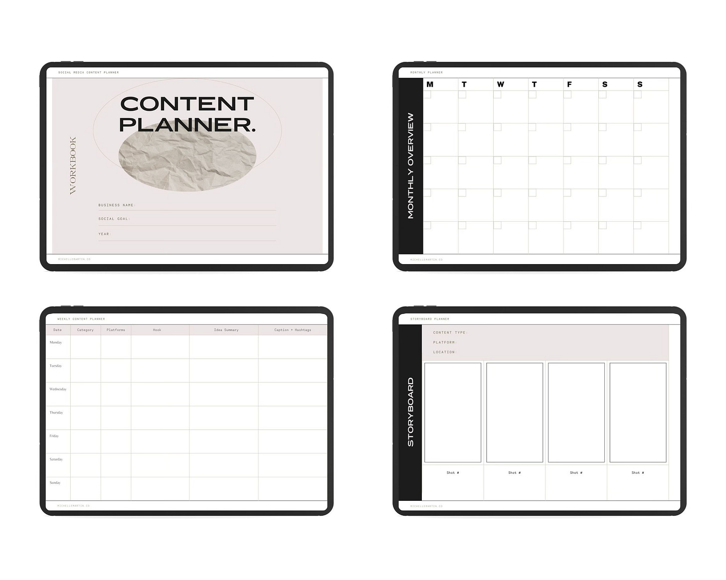 So, I made this rather dashing social media planner for myself (at first). I wanted something SIMPLE where I could write down general outlines and ideas on a weekly/monthly basis. I wanted it to have just enough info on it that I could read it and go off and shoot something, but not so much detail that it become overwhelming, like filling out a 17 part Notion page template for a single social post. No thanks.